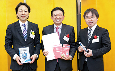 (左から)サンワサプライからはパソコンのマウス、トレンドマイクロからはウィルスバスターなど多数、アイ・オー・データ機器からはボールペン型のUSBメモリが贈られた