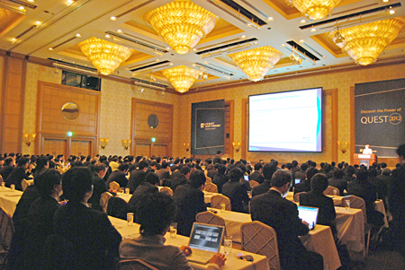 イベントは、大越社長と、米本社のマット・ビタル セールス担当バイスプレジデントが事業戦略を語った後、日本クエスト・ソフトウェアのシステムコンサルタント3人が、製品の優位性を説明するという合計約3時間のプログラム。製品を販売するパートナー企業が聞き入った。