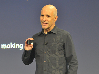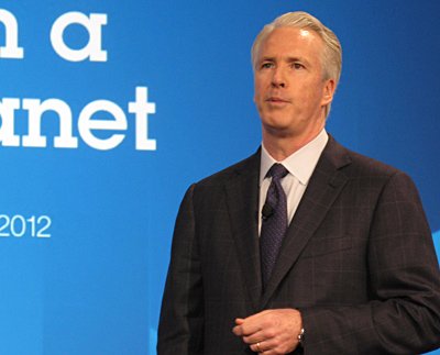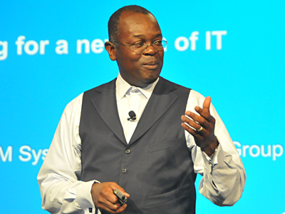 続いて、システム&テクノロジーグループのロッド・アトキンス上級副社長が、IBMの実績を説明した。2011年度は、ハードウェアが前年度比で6%、ソフトウェアが11%も伸張。アトキンス副社長は、「IDCの調査によれば、2012年の第一四半期(12年1~3月)にとてもエキサイティングなことが起き、世界市場でIBMサーバーがヒューレット・パッカード(HP)を抜いてNo.1になった」と、誇らしげに語った。メインフレームのリプレース市場などで、ワークロードに応じて適切なハードウェア資源を割り当てられる最新エンタープライズシステム「IBM zEnterprise」が好調だったことなどによって、IBMサーバーがトップに立ったという。