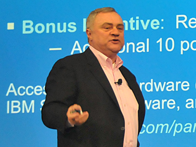 この後、ソフトとシステムを統括するスティーブ・ミルズ上級副社長が、ソフトとハードを一緒にした業界ソリューションの販売を増やすことを目的に、BP向けの新インセンティブ(報償金)プログラム「IBM Solution Accelerator Incentive」を発表した。これは、ハードとソフトを融合して販売したBPに対して、IBMのハードに5%、ソフトに15%、ビッグデータ関連などでソーシャルを活用するソリューションを販売した場合に10%が、それぞれに報償金(キャッシュバック)を出すプログラム。