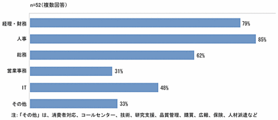 大手日本企業の76%はシェアードサービスを導入済みで、業務別では人事・経理・財務に集中。一方で、シェアードサービスの目的を達成できた企業は約半数にとどまった。目的達成のために重視した施策と今後重視する施策のトップは「業務の標準化」だった。