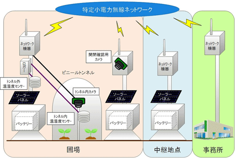 実証実験のイメージ 実証実験の開始にあたって、富士通は西八代郡農業協同組合(JA西八代)、農産物生産・販売の旬果市場社と「やまなし企業の農園づくり協定」を締結。JA西八代と旬果市場の圃場に、農園情報センシングネットワークを導入する。ビニールトンネルの換気のタイミングと温湿度情報を収集し、無線ネットワークを通じて事務所にデータを定期的に送信。データを分析することで、栽培に最適なビニールトンネル内の温湿度管理を支援する。