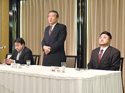設立3周年で初めて記者会見を開いたJDCC(左から江崎浩理事・運営委員長、白川功理事長、磯部眞人事務局長)