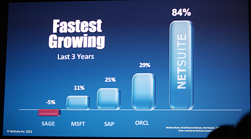 ユーザー企業が、競合であるMicrosoft Dynamics Great PlainsなどからNetSuiteにリプレイスする理由について、「マイクロソフトのメンタリティは“Cloud also”だが、ネットスイートは“Cloud first”だ。急成長していて、迅速な経営判断が求められる成長企業に、2層ERP戦略でアプローチしてきた結果が数字に表れている」と、ネルソンCEOは語った。