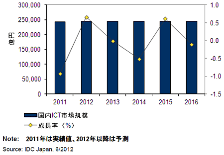 2011年の国内の景気は、東日本大震災や欧州財政問題、タイの洪水などの影響を受けて低迷した。この影響で、国内IT市場、国内ICT市場ともにマイナス成長となった。2012年は、復興財政支出や金融緩和によって景気が浮揚し、スマートフォン、タブレット&eReader、ITサービス、ソフトウェア、ストレージ、データ通信サービスが成長し、国内IT市場、国内ICT市場ともにプラス成長となる見込みだ。