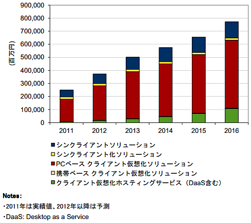 また、クライアント仮想化ソフトの出荷ライセンス数は、2011年は前年比27.6%増の94万ライセンス。2012年には44.9%増の136万ライセンスになり、2016年には302万ライセンスまで増加すると予測している。