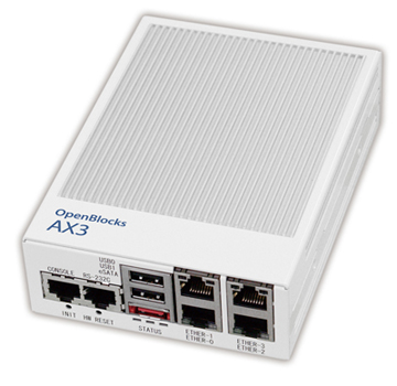 「OpenBlocks AX3」は、CPUにデュアルコアARMADA XP 1.33GHz(ベースアーキテクチャ:ARM Cortex-A9)と、4もしくは2のGbEポート、オンボード1GBのメインメモリ空間を備えたハイエンドモデル。