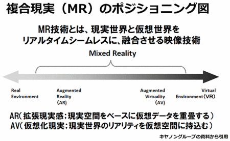 MRのポジショニング。現実に仮想をもち込むARから仮想に現実をもち込むAVまで、幅広くカバーする。実物の大きさを忠実に再現するのも特徴の一つ