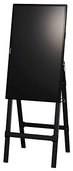 「TP32B」は、厚さが最薄部分で29.9mm、本体重量は6.5kg。折りたたみ式のイーゼルスタンドが付属する。ディスプレイには、メディアプレーヤーとステレオスピーカーを内蔵。コンテンツを格納したUSBメモリを挿すだけで自動再生するほか、リモコン操作でコンテンツのランダム再生や、再生の開始と終了時間を設定することができる。コンテンツの再生に専用のソフトウェアは不要。静止画(JPG)や動画、Flashムービー、音声ファイルなど、幅広いファイル形式に対応する。