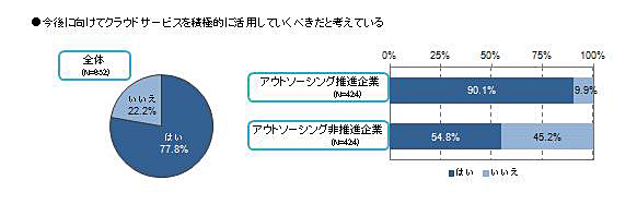 調査結果では、今後に向けたIT戦略の方向性として、「クラウドサービスを積極的に活用していくべきだと考えている」とした回答者が77.8%に上り、全体の4分の3を超えた。とくに、今後に向けて「アウトソーシングを積極的に推進する」とした回答者に限れば、実に90.1%がクラウドの活用に前向きな姿勢を示し、IT資産の最適配置、運用業務の効率化といったアウトソーシングの観点からも、クラウドサービスが有力な選択肢として位置づけられていることがわかった。