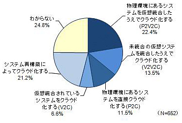 既存システムをクラウド化する手順としては、「物理環境にあるシステムを仮想統合したうえでクラウド化する(P2V2C)」が22.4%で最多。「未統合の仮想システムを統合したうえでクラウド化する(V2V2C)」の13.5%、「仮想統合されているシステムをクラウド化する」の6.6%と合わせて40%以上が「仮想統合」という手順を踏んだ後にクラウド化する方針であることがわかった。仮想化技術は、クラウド化を実現するステップの一つとしても引き続き重視されるとみる。その一方で、こうした手順を踏まない“クラウド・ファースト派”も一定数存在しており、なかでも「システム再構築によってクラウド化する」とした回答は21.2%に上った。
