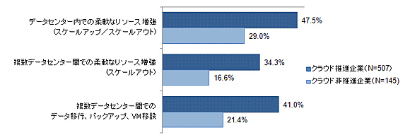 このほか、とくにクラウドを積極的に活用したいと考える企業については、「データセンター内」はもとより「複数データセンター間」でも、柔軟なリソース増強(配分)やデータ移行/バックアップへの対応を求める傾向が表れた。ITRは、高い拡張性を備えたデータセンター・サービスを優先して選定する動きが強まるとみている。