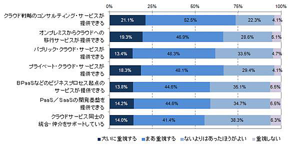 一方、アウトソーシング事業者に対しても、「今後はクラウドへの対応力が厳しく問われることになる」と指摘。「クラウドサービスを積極的に活用する」とした507人に対して、アウトソーシング事業者に求める能力について問うたところ、「クラウドへの対応力を重視する」とした回答が多数を占めた。とりわけ「コンサルティング・サービス」「移行サービス」「プライベート・クラウド・サービス」が重視される傾向が強いことがわかった。(信澤健太)