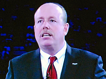 ターナーCOOは、会場に詰めかけた約1万6000人のパートナーに対して、身振り手振りを交えながら、約1時間熱弁を振るった。最初に「昨年度の好業績はパートナーのおかげ」と感謝の気持ちを伝え、パートナーの力を称えた。その後、資料を大型ディスプレイに映し出しながら、自社の優位性と2013年度の戦略を説明した。とりわけ目を引いたのは、競合他社との比較データだ。