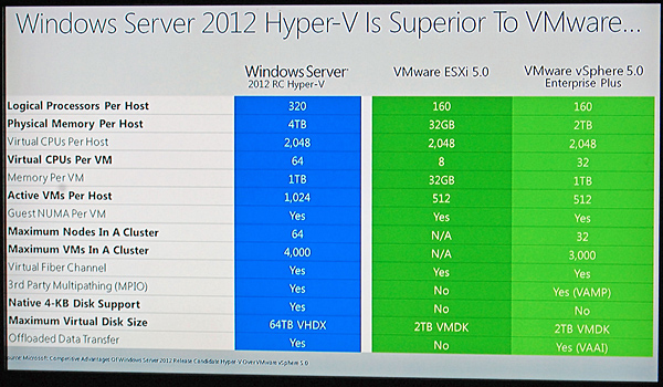 ケビン・ターナーCOO 仮想化ソフト「Hyper-V」では、ヴイエムウェアの「VMware ESXi 5.0」「VMware vSphere 5.0 Enterprise Plus」と自社製品の機能比較表を用いて、自社製品の優位性を訴えた。また、調査会社の米IDCの資料を提示して、ヴイエムウェア製品とシェアを比較。成長率にも言及し、x86サーバーの仮想化では、2012年第1四半期までの4年間でマイクロソフトがシェアを26.6ポイント伸ばしたのに対し、米ヴイエムウェアの伸びは15.8ポイントで、自社が勝ることを強調した。