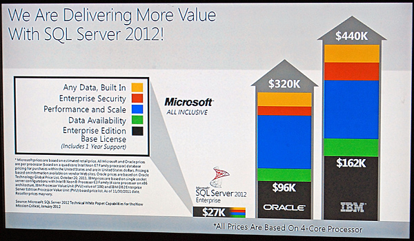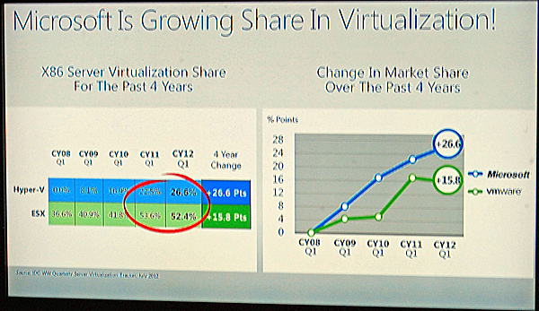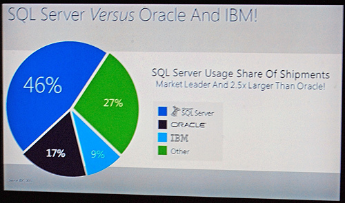ヴイエムウェアとのシェア争いの推移 データベース(DB)ソフトでは、「Microsoft SQL Server 2012」のコストパフォーマンスの高さを訴えた。オラクル、IBMの競合製品と比較して、「Microsoft SQL Server 2012」が低価格であることを訴えた。IDCのデータを活用したシェアも示し、「Microsoft SQL Server」がオラクルの2.5倍以上のシェアを獲得してトップに立っていることを伝えた。