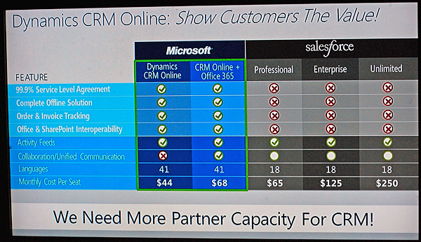 DBソフトのメーカーシェア オンライン型のCRMサービスでは、「Microsoft Dynamics CRM Online」と、米セールスフォース・ドットコム製品との機能比較表を示し、品質の高さと機能の多さ、価格で勝っていることを強調した。