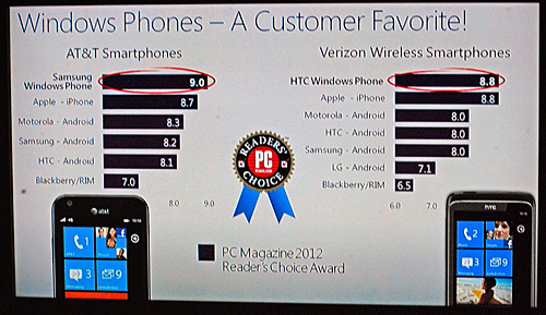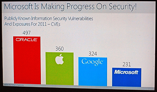 脆弱性数の比較 スマートフォンでは、「Windows Phone」が米国のコンピュータ雑誌『PC Magazine』の読者調査結果で、AT&T、ベライゾン・ワイヤレスの両携帯電話通信事業者でNo.1のスマートフォンであることを示した。検索サービス「Bing」についても、2012年1月時点でグーグルのシェアを上回ったことを強調した。