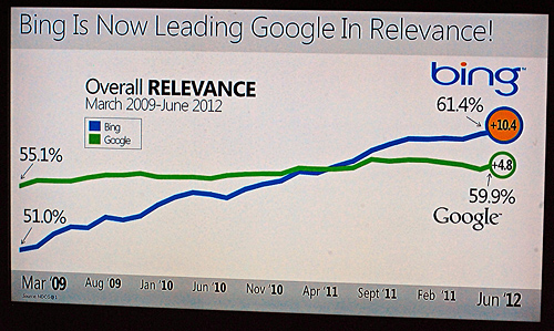 検索サービスでの米グーグルとの比較表 ターナーCEOはこれらの資料を用いて、顔に汗をにじませながら約1時間、自社の優位性を力説。「私は手ごわい競争相手と戦うのが大好きだ。ライバルを尊敬はしている。だが、恐れない。私たちは常に攻撃的であることで、パートナーとともに勝利を勝ち取りたい」と講演を締めくくり、パートナーの士気を高めた。(木村剛士)