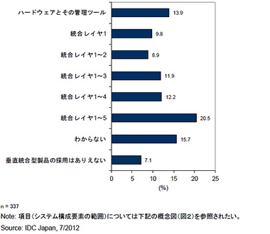 ユーザー企業が挙げた「垂直統合型製品に求める最適な統合の範囲」は、ハードウェアからアプリケーションソフトまで統合したもの(統合レイヤ1~5)が最多だった(図2参照)。サーバーベンダーが提供する垂直統合型製品も、統合レイヤ1~5が多い。