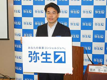 新しいロゴマークを紹介する弥生の岡本浩一郎社長。「『事業コンシェルジュ』としての弥生の進化を表したもの」だという。