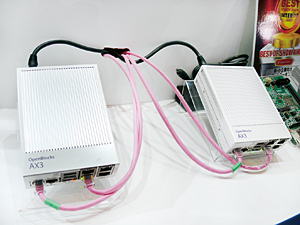 「OpenBlocks Aファミリ」のラインアップは、「OpenBlocks AX3」「OpenBlocks A6」の2モデル。「AX3」は、CPUとしてデュアルコアARMADA XP 1.33GHzを搭載し、GbE4ポートとGbE2ポートを選択できるほか、オンボード1GBのメインメモリ空間などを備えたハイエンドモデルに位置づけられる。木村友則・製商品事業本部技術部マイクロサーバ技術課長は、「通信キャリアやサービスプロバイダ(SP)などがDCで導入したいという引き合いが多い」と状況を語る。「OpenBlocks A6」は、CPUにシングルコアARMADA 310 600MHz、GbE1ポート、オンボード512MBのメインメモリ、SATAポート1、GPIO(8bit)、RS232Cポート×2、USBポート×1を備え、周辺環境温度55℃での動作も保証している。
