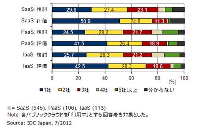 パブリッククラウドを提供するベンダーは増えているが、ユーザー企業が検討・評価するベンダー/サービスの数は限られている。パブリッククラウドを利用している企業が評価するベンダーの数は「3社以内」とした回答が多く、ベンダーは認知度を向上するとともに、検討・評価の対象になるような提案を行うことが重要だとした(図2参照)。