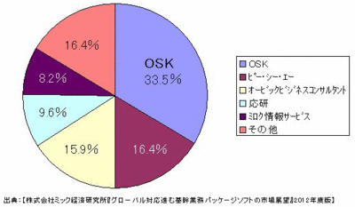 OSK(宇佐美愼治社長)は、8月7日、調査会社のミック経済研究所(有賀章社長)の『基幹業務パッケージソフトの市場展望 2012年度版』で、「SMILEシリーズ販売管理」が中規模企業向けERPパッケージ販売モジュールの出荷金額で5年連続シェア1位を獲得したと発表した。