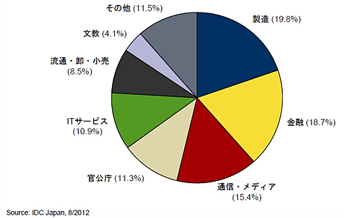 2011年の国内サーバー市場の出荷額構成比は、製造が前年比1.4%増の19.8%、金融が3.1%減の18.7%、通信・メディアが2.5%増の15.4%を占めた。