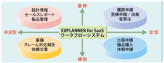 「EXPLANNER for SaaS ワークフロー」は、安価で、申込みから最短3日で利用できるクラウドサービス。約100種のテンプレートからなる業務別申請パックを用意する。「EXPLANNER/FL V4.0」は、申請・承認等の業務処理をタブレット端末などのスマートデバイスから実行できるようにして、業務プロセスのスピードアップ、業務の効率化を図るパッケージソフト。今後3年間で、クラウドサービスとパッケージを合わせて1000社への販売を目指す。