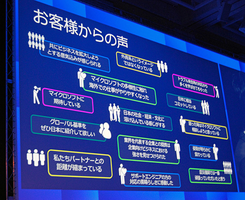 また、ユーザーアンケートでは、日本マイクロソフトの評価が高まっていることをPR。ユーザーとパートナーの声を紹介し、「『外資系というイメージがなくなっている』というコメントがあったが、これは私にとってほめ言葉。逆の道を進んでいる外資系企業がいるが、われわれが日本に根ざした企業を目指しているなかで大変ありがたい声だ」と語った。(木村剛士)