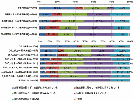 個人向け無償クラウドサービスの許可状況では、年商5億円未満/従業員数20人未満の企業で、「業務種別を問わず、全面的に許可されている」の回答が突出して多く、40.5%に達した。