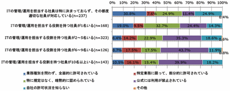 「ITの管理/運用を担当する役割をもつ社員が1名いる」のSMBでは、「とくに規定はなく、暗黙的に認められている」が32.7%と最も高かった。IT担当者が1名しかいないSMBでは、担当者が個々の社員のITツールの管理までは対応できず、利用可否の基準があいまいなまま、暗黙の了解で利用する状態になりやすい。ノークリサーチは、IT担当者1名のSMBが個人向け無償クラウドサービスを安全に活用できるツールやサービスが望まれている状況だとしている。