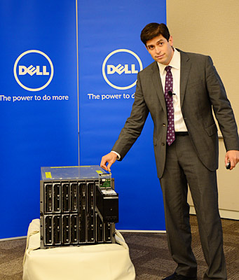「Dell EqualLogic PS-M4110」を紹介するトラビス・ビジル エグゼクティブ・ディレクター 高度な仮想化機能や自動ロードバランシング機能によって、パフォーマンスの向上とストレージ運用コスト削減を実現する。構成の異なる四つのタイプを用意し、価格は最小構成で265万円から。