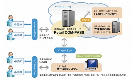 卸やメーカーの負荷を軽減し、流通事業者向けEDI(電子データ交換)メッセージの標準規格である流通BMSの導入と運用を支援するクラウドサービス。「Retail COM-PASS」を通して小売店とデータを受信することで、小売店ごとに異なる流通BMSのメッセージやデータ設定を修正し、不足している項目は補足して、共通のソフトウェアインターフェースでデータを提供する。複数の小売店・量販店に対応し、小売店に新店を追加したときには「Retail COM-PASS」上で新店を登録するので、ユーザーはメンテナンスの必要がない。