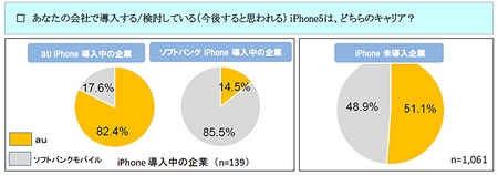 iPhoneを導入していない企業では、51.1%がau、48.9%がソフトバンクモバイルを選択すると回答。キャリアを選択した理由は、auを選択した企業の多くが、「ネットワーク面での信頼感」を理由に挙げ、ソフトバンクモバイルを選択した企業は、「価格・料金面での割安感」を挙げた。