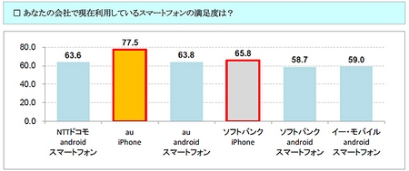 スマートフォンの満足度では、auのiPhoneが77.5%ポイントで最も高く、次点はソフトバンクモバイルのiPhoneの65.8ポイントだった。(真鍋武)