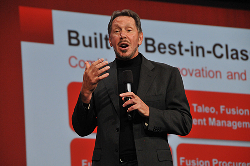 エリソンCEOが二度目の基調講演で説明したのは、IaaS、PaaS、SaaSのクラウド環境のうち、SaaSアプリケーションについて。すでに、HCMスイート、CRMスイート、ERPスイートが揃っており、クラウド・サービスを支えるインフラや基盤に、新たにソーシャル・サービスが加わり、「ディプロイメント(ネットワークアプリケーションやウェブサービスなどを利用できるように準備すること)された状態でSaaSアプリを選択できるのは、オラクルだけだ」と、他社のインフラの上でクラウド環境を構築する方式のセールスフォース・ドットコムを引き合いに出し、差異化を強調した。