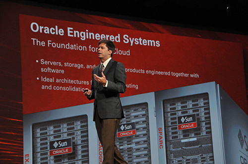 「Engineered systems」は、サーバー、ストレージ、ネットワークなどのインフラと、ソフトやミドルウェアを開発段階から密に融合させたシステムだ。「融合することで、システム導入から運用・管理の仕方までを劇的に変化させ、驚くべき結果をもたらした」(ファウラー上級副社長)という。事例として、ソフトバンクモバイルが大規模データウェアハウス(DWH)の刷新で「Exadata」を導入し、データベースのランニングコストを50%も削減したことを挙げた。