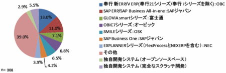 年商500億円未満のSMBに対して、「導入済みの製品/サービスのうち最も主要なもの」をたずねた結果、2011年から引き続き「奉行新ERP/V ERP」がシェアトップで、2位が「SAP ERP/SAP Business All-in-One」、3位が「GLOVIA smartシリーズ」という順位だった。