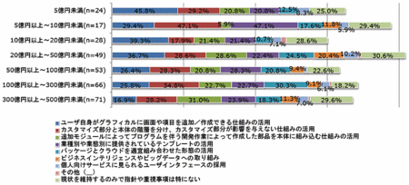 「ERPの活用における今後の指針または重視事項」では、「カスタマイズ部分と本体の階層を分け、カスタマイズ部分が影響を与えない仕組みの活用」(「Microsoft DynamicsAX」の階層化構造など)が最も多く挙がり、「ユーザ自身がグラフィカルに画面や項目を追加/作成できる仕組みの活用」(「SMILEシリーズ」のCustom AP Builderなど)がそれに続いた。