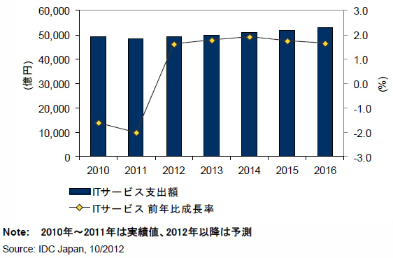 国内ITサービス市場は13年以降もプラス成長を持続するが、欧州の債務危機、中国やインドなど、新興国経済の成長鈍化、14年以降の消費増税などの影響から、国内企業はITサービス支出に対して慎重な姿勢を維持し、16年までの市場成長率は1%台にとどまると予測。リーマンショック前の08年の市場規模を回復するには、16年までかかるとしている。