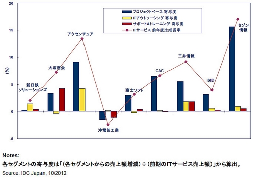 2012年3月期に国内ITサービス市場で売上高(IDC推定)がプラス成長になったベンダーは、大手ITベンダー11社では約半数にとどまったのに対し、準大手/中堅ITベンダーでは9社中8社に上った。準大手/中堅ITベンダーは、大手ITベンダーと比較して主要顧客のIT投資の増減による影響が大きく、主要顧客の投資回復が好業績につながったと分析する。