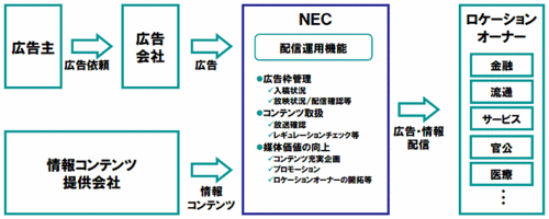 NECが、広告会社や情報コンテンツプロバイダから提供を受けた企業広告、自治体の広報、情報番組などを組み合わせて、既設のデジタルサイネージに配信するサービス。第一弾として、金融機関を媒体社(ロケーションオーナー)とし、広告主やコンテンツプロバイダが個別に媒体社と交渉・契約することなくコンテンツを配信できるサービスを提供する。すでに千葉銀行、足利銀行などが、店舗のデジタルサイネージへの広告・情報コンテンツの配信を開始している。