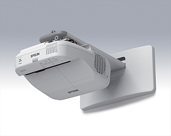 「EB-436WT」「EB-426WT」は、カラー・全白とも明るさ3000lm(EB-436WT)・2500lm(EB-426WT)、解像度WXGA対応のほか、16Wのスピーカー出力、マイク入力、HDMI端子搭載など、教育現場で十分な基本性能とインタラクティブ機能を備える超短焦点デスクトップモデル。83cmの距離からワイド80型の大画面を投写できるので、学校の教室では教卓に設置できる。