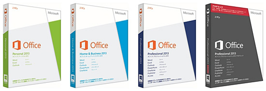税別価格は、家庭向けの「Office Personal 2013」が2万9800円、家庭や個人事業主向けの「Office Home and Business 2013」が3万4800円、ビジネス向けの「Office Professional 2013」が5万9800円、学生や教職員向けの「Office Professional Academic 2013」が2万8381円。