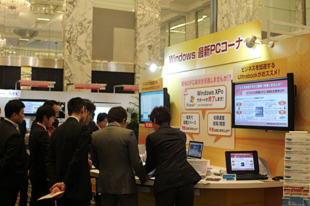 会場は、ソリューションゾーン、ハードウェアゾーンの二つのゾーンと、「テーマステージ」や「モデルオフィス」などのデモスペースで構成。ソリューションゾーンでは、業務システムやセキュリティ、文書管理システムなど、ユーザーがすぐに導入できる「即戦力システム」を提案しているほか、ハードウェアゾーンでは、ウルトラブックやスマートデバイス、サーバー、ストレージなど、最新製品を展示している。また、デモスペースでは、ソリューションの実際の活用方法を具体的にわかりやすく紹介し、多くの来場者が足を止めていた。