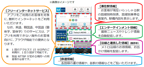 対応端末に専用アプリ「MANTA」をインストールすると、検索の手間なく滞在駅の時刻表、構内図などの駅情報が取得できる。また、サービスエリア内では、自動配信される当日のニュース動画、手軽に読めるトレンド情報など、日常生活に役立つコンテンツが閲覧できる。また、駅構内では無料でインターネットが利用できる「フリーインターネットサービス」を提供する。