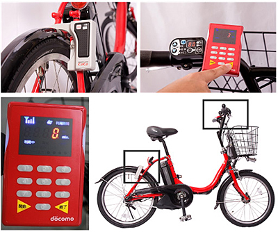 自転車本体のイメージ これまでサイクルポート(駐輪場)がもっていた通信機能やGPS機能、自転車の貸出し停止や電動アシスト機能のバッテリ残量の把握などの遠隔制御機能を、直接自転車本体に搭載することで、自転車本体だけで貸出・返却管理、施錠管理を完結させることができる。これによって専用の駐輪場システムが不要になり、導入コストを大きく削減することができる。