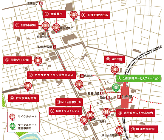4月15日までキャンペーンを実施 「DATE BIKE」は、仙台市中心市街地の活性化を図る一方で、東日本大震災による仮設住宅居住者向けに、利用開始から60分までの無料サービスを行う。また、売上げの一部(3~5%の範囲)を復興支援に充当する。(田沢理恵)